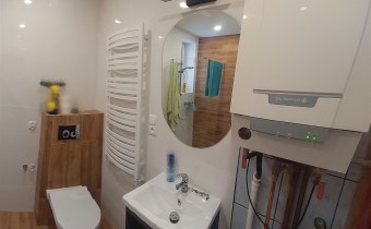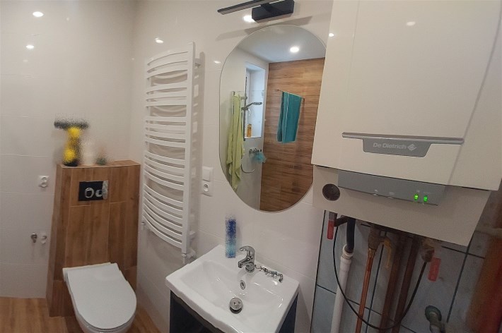 Mieszkanie po remoncie - stan bardzo dobry. DO WPROWADZENIA. Na ścianach gładzie gipsowe, na podłodze panele PCV. Łazienka na piętrze – po zakończonym właśnie remoncie, nowa kabina prysznicowa, WC, umywalka. W łazience na poddaszu – wanna. Stolarka okienna PCV. Prąd, kanalizacja, woda – z zasobów miejskich.